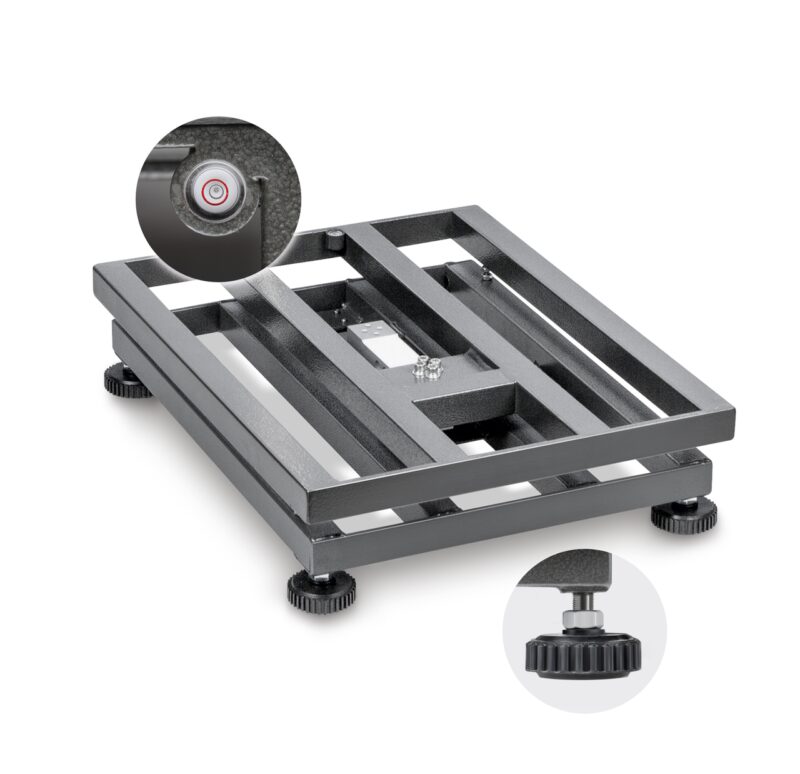 - Piattaforma: piatto di pesata acciaio inox, sottostruttura in acciaio verniciato, cella di carico in alluminio rivestita in silicone con protezione antipolvere ed antispruzzo IP65. Livella e piedini regolabili per un livellamento esatto della bilancia; per risultati di pesata di massima precisione