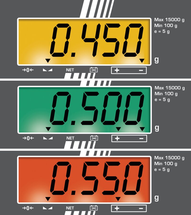 - Innovativa pesata con valore di tolleranza (checkweighing): Il colore del display cambia a seconda del risultato della pesata (troppo leggero/ok/troppo pesante) ed è pertanto utile per porzionare, dosare, smistare